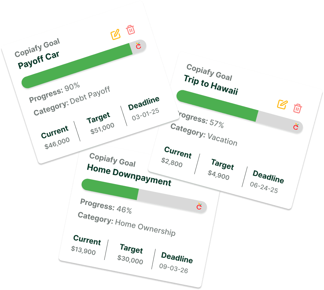 Emergency funds that stay empty. Vacations that never happen. Down payments that feel impossible. The problem isn't your motivation—it's that your goals live in your head, not your system. Copiafy turns dreams into trackable progress with deadlines, milestones, and visual wins.
